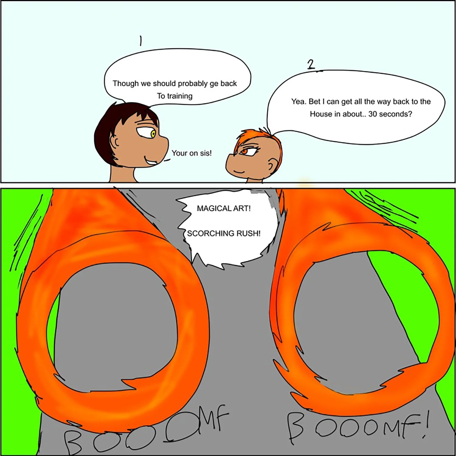 MAGICAL ART! SCORCHING RUSH! Boomf! Boomf! [Two circular flames form as Erin and Eisa take off.]